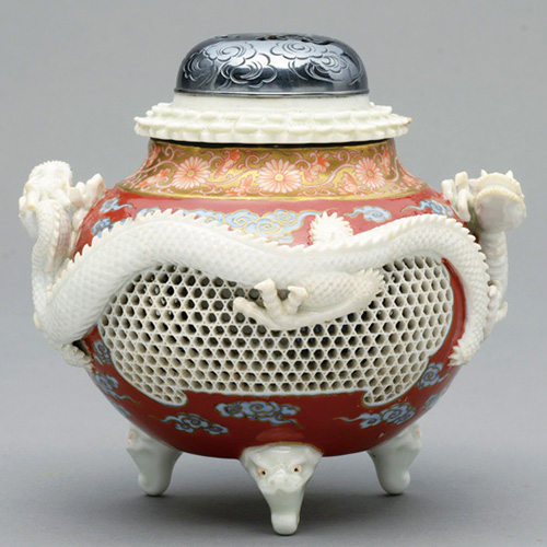 色絵籠目貼付龍文香炉 菊御紋付秋海棠模様