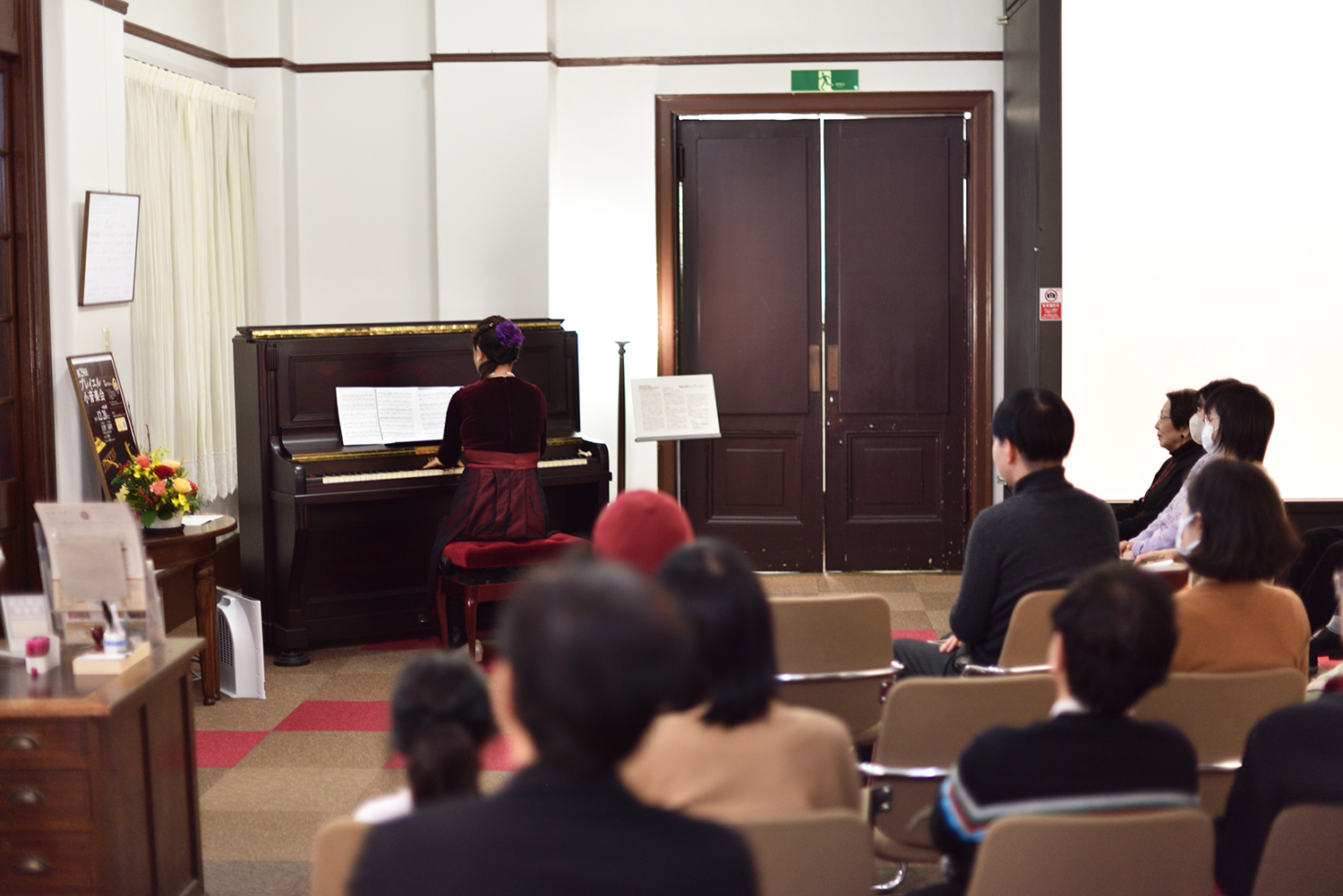 鍋島紀久子様(13代直泰夫人)の婚礼調度のピアノ「プレイエル」の音色を楽しむ小音楽会を開催しました。演奏は北島千夏子さん(佐賀市)。プレイエルのピアノを愛用したショパンの演目を中心に、チャイコフスキーやリストなど全8曲を演奏しながら、演奏者自身によるトークで曲や作曲者、曲にまつわる恩師との思い出などもお話しいただきました。優しくも迫力のある素敵な音色が館内に響き渡り、2回の公演あわせて73名の方々にお楽しみいただきました。 |