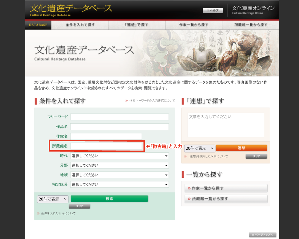 国内の文化遺産に関するポータルサイトです(文化庁運営)。 「所蔵館名」の欄に「徴古館」と入力すると、データベースに登録されている徴古館収蔵品が表示されます。 (全国の博物館・美術館等から提供された作品や国宝・重要文化財など、さまざまな情報をご覧いただけます ) より詳細な検索方法については、以下のページをご覧ください。 ➡検索方法について