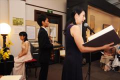 プレイエルのピアノは、朝香宮家の紀久子女王が鍋島直泰様に降嫁された際の婚礼調度のひとつです。今回はピアノとヴァイオリンの二重奏で、ピアノ演奏を西村純子さん、ヴァイオリンとヴィオラの演奏を仲松慶さんのお二人にお願いしました。プレイエル作曲のヴァイオリン曲を、ピアノとの二重奏にアレンジした曲や、井上順子さんによる朗読を交えた貴志康一作曲の竹取物語が特に好評でした。 現在徴古館では「朝香宮家への贈りもの」展を開催中で、宮家にゆかりの品々に囲まれて皆さま至福のひと時を過ごされていました。 |
