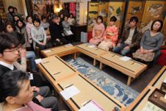 「初春 ―祝いと香り」展では初公開を含むさまざまな香道具を展示しています。これにちなみ、「初春の香りを楽しむ」と銘打ち、数種の香を聞き当てる組香(源氏香)という遊びを行いました。お手前を披露していただいたのは志野流香道九州松隠会の椛島禅徹先生とそのお弟子さんたち。源氏香に参加された10名の方々や、その様子を見学した参加者の大半が香道の初心者でしたが、椛島先生の分かりやすく楽しい解説を聞きながら、香炉を手に取り五つの香木を聞き比べました。お着物での参加者も多く、雅びな品々に囲まれて、初春らしい雰囲気を堪能されていました。 |