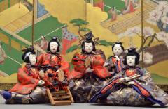 明治45年(1912)3月3日、朝香宮鳩彦王の第一王女紀久子様の初節句の折に、叔母にあたる泰宮様(聰子内親王、東久邇宮稔彦王妃)より贈られた五人囃子。侍烏帽子に直垂姿の童子が、左より太鼓・大鼓・小鼓・笛・謡の順にならび、表情もにこやかにお囃子を奏でている。江戸時代を通して「武家の式楽」として嗜まれた能楽であるが、江戸後期に至り囃子方をモデルとした雛人形の五人囃子が誕生するやいなや、江戸っ子に好まれ大流行したという。