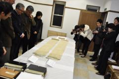 昨年9月に存在が確認された「東遊歌風俗歌」の本格的な調査を実施しました。調査には獨協大学飯島一 彦教授、上野学園大学福島和夫教授、法政大学スティーブン・ネルソン教授にあたっていただきました。書風や紙質、装丁などの検討、また重要文化財「東遊歌 神楽歌」との比較の結果、書写年代が平安後期とほぼ断定され、重要文化財級の資料であることが確認されました。当日の夕方には記者会見を開き(左写真)、 翌日の各紙で広く紹介されました。 |