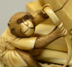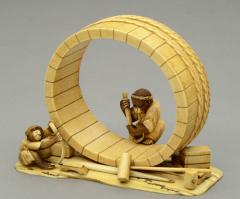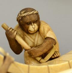 大正2年(1913)12月2日に11代鍋島直大夫人栄子が昭憲皇太后より拝領した牙彫置物。擬人化された猿が身の丈よりも大きな桶作りに精を出すさまをあらわしている。桶の側面に底板をはめるための溝を削る親猿と、その傍らで鉋屑で遊ぶ子猿、桶の周囲には道具箱や槌を散らしている。