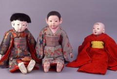 時代 明治時代 着せ替え式の抱き人形。胴体や手足を裂でつなぎ、自由な肢体をとる。模様・色など典型的な明治時代の着物。赤い紋縮緬の衣装は御所風の仕立て方。一番小さな人形は京都製ヵ。 |