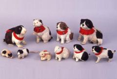 時代 明治時代 毛作り人形は犬6、鼠2、猫1、兎3。絹糸でできた毛をそろえて貼り込み、犬、猫、兎、鼠の動物を形作った人形。仕草や表情が愛らしい。毛植細工の動物は明治始めころ輸出品としてもてはやされた。 |
