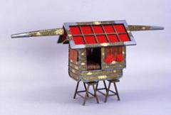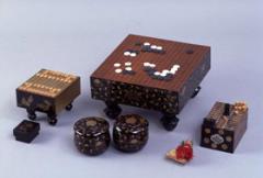 三面盤 時代 明治時代 双六盤の盤底に「御所にて/拝領せし双五六盤/竹印」とある。栄子は若いとき宮中に仕えており、結婚する前は竹子と呼ばれていたので竹印と栄子は何らかの関係があるのかもしれない。 |