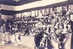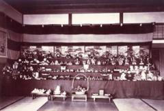 時代 明治42年 直大・栄子夫妻所用の雛人形を中心に飾り付ける。洋風の部屋一杯に飾り付けがなされている。軍服姿や看護婦姿の人形なども飾られ、時代性を反映している。今に遺る人形を探し、今はなき人形に思いを馳せることができる、見るほどに興味深い写真である。 |
