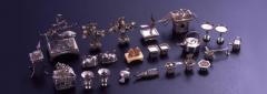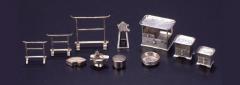 置物類(打出の小槌、犬張子、三方、屋形船他)。屋形船には茅葺き屋根や木目、兎付き三方には唐草を線刻。禎子所用銀製雛道具は他に文房具、茶道具、香道具等、その種類は多岐にわたり、いずれも精巧な造りである。