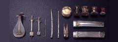 楽器類(箏の琴・琵琶・三味線・胡弓・鼓・笙・横笛・太鼓他)。箏の琴には木目を線刻。箏の琴、琵琶は銀の質感から明治か。