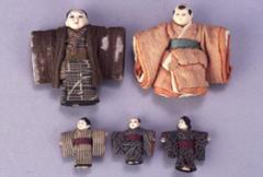 時代 幕末 禎子所用銀製雛道具と同箱入りの牙首人形3体。それぞれに着付けがなされ、表情も豊かである。 |