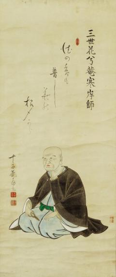 花鋏を手にして座す僧形の生花去風流・三世家元の花兮庵寒岸。画面上部には、佐賀城下・高木町裏小路の観照院(現・佐賀市高木町)住職で俳諧をよくした十方庵画山による詠句 ――徳の香も 普し華の 根〆から
