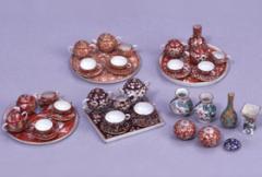 時代 明治時代 有田深川製磁の雛道具。底面には富士に流水マーク。これほど小さく精緻なつくりでしかも文様の美しいものは他に類例がない。雲鶴や梅樹、宝相華唐草の模様のカップとソーサー、ポットとミルク・砂糖入れといった喫茶道具、水仙、葡萄蔓、牡丹唐草の模様の花瓶や食籠など。 |