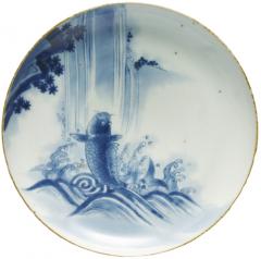 鯉の滝登りを描いた染付の皿。染付の濃淡のみで波間や飛沫が巧みに表される。登竜門として知られ立身出世を意味するこの図は、江戸時代の出版物のなかにもしばしば見受けられるポピュラーな画題である。裏面には唐草文を廻し、高台内に「享保拾壹年製」と銘が入れられた制作年の明らかな作品。染付や祥瑞などに多く認められる銹による縁取りは、金で施されている。