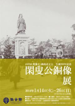 平成26年は、10代佐賀藩主・鍋島直正公(閑叟(かんそう)/1814~71)の生誕200年にあたります。閑叟公は、行財政・教育の改革、殖産興業の振興などにより、幕末佐賀藩を雄藩になした名君として敬意をもって語られますが、かつて高さ4mを超える閑叟公の銅像が佐賀市松原に建っていたことは、次第に忘れ去られようとしています。銅像は、閑叟公の風姿を永劫にわたり知らしめ欽慕の念を仰がせんがため、生誕100年にあたる大正2年(1913)県内外からの寄附金により造立されました。この美挙に対し11代鍋島直大公は、県内初の図書館「佐賀図書館」を開設し県民への謝意を表しました。本展は、古写真や銅像模型等により今はなき閑叟公銅像の風姿を偲ぶ企画展です。