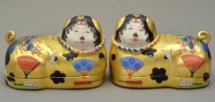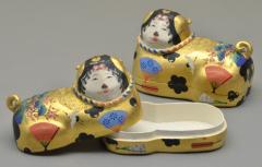 犬をかたどった張子の置物で、犬筥(いぬばこ)ともいう。犬が多産であることなどにあやかり、中世以降に出産時のお守りとして犬張子を用いる風があった。やがて江戸時代の婚礼道具にも用いられ、安産のお守りや幼児の息災祈願のために飾られた。本品は松竹梅や鶴、扇などで彩られた、雛道具としての犬張子。