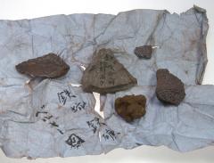 和紙に包まれた60袋あまりと、数十点の付属標本類が含まれている。袋には、「ベルギー国 鉄坑ノ鉄礦」、「アメリカ産人参」、「長崎来礦石」、「薩州礒ノ濱辺…拾ひ取候砂鉄」などと墨書されている。これらは、佐賀藩士の小出千之助が参加した万延元年(1860)の遣米使節団や、文久元年(1862)に派遣された遣欧使節団、安政4年(1857)の薩摩藩視察等の際に、10代佐賀藩主鍋島直正が家臣に命じて収集させたものと考えられる。