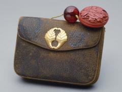 胴乱とは薬・印・煙草・銭などを入れて腰に下げる方形の袋のこと。堂々とした鍋島家の家紋筋杏葉紋の金具をつけた革製胴乱で、元は10代佐賀藩主鍋島直正の手回り品と思われる。牡丹を彫漆した堆朱の根付は、銘から讃岐の玉楮象谷の作とわかる。箱書に「嘉永二年(1849)己酉四月廿三日 拝領 古川松根」と墨書され、側近だった佐賀藩士古川松根が直正から拝領したものとわかる。松根が記した直正の言行録「古川松根筆記」には、直正は手回り品に杏葉紋を濫用することを好まなかったという一節がある。杏葉紋の特別な扱いを知る松根への拝領品である。
