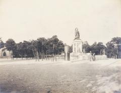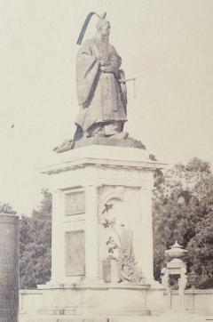 10代佐賀藩主鍋島直正公(1814~71)の生誕100年を迎えた大正2年(1913)。その風姿を永劫にわたり知らしめ欽慕の念を仰がせんがため、大隈重信を委員長とする委員会が組織された。県内外からの約十万円にのぼる寄附金により、佐賀市松原(北御堀端)に銅像が建設された。広々とした園内に、台座も含めると10メートルを超える巨像が聳え、左前には寄附者芳名塔が建つ。また松林を隔てた左後方の一角には側近として終生直正公に仕えた古川松根の銅像も見える。銅像前で正面を向くお二人は梨本宮守正王(もりまさおう)と伊都子妃(いつこひ)。伊都子妃(1882~1976)は11代鍋島直大公の二女で、明治33年(1900)守正王に嫁ぎ宮妃となられた。