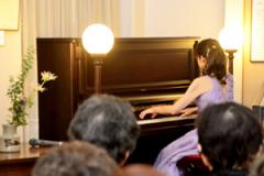 平成13年の初開催以来、 20回の節目を迎えたプレイエル小音楽会。今回は、龍谷短期大学など佐賀市内を中心にピアノ講師をつとめる漆原尚子さん(佐賀市在住)にショパン・シュー ベルト・シューマンを演奏いただきました。ベルベッドと形容されるプレイエルの優雅で滑らかな音色。久し振りの晴天に恵まれ、約90名がお越しくださいま した。大ホールとは異なり身近で奏でられる演奏に、皆さましばし暑さを忘れて心穏やかに耳を傾けていました。 |