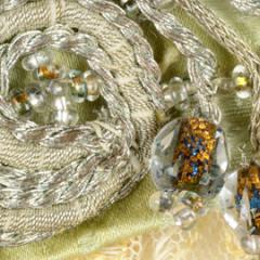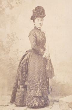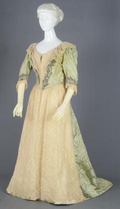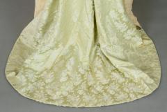 「鹿鳴館の華」と謳われ明治の社交界をリードした鍋島栄子(11代鍋島直大公夫人)のドレス。後腰を膨らませるバッスルスタイルは鹿鳴館時代に多くみられる。レースチュールの繊細な織り、刺繍された果実と葉の丸み、全体をまとめる柔らかく淡い色使いなどが優美さを漂わせている。鍋島家に出仕していた岡部トミが栄子夫人より拝領し、このたびご子孫から寄贈された。
