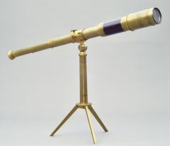 四段に伸縮させることができる遠眼鏡で「ヤルド遠眼鏡」と呼ばれる。本品は脚付きだが、手持ち式の遠眼鏡とともに鍋島家に伝来した。佐賀藩が福岡藩と共に担った長崎警備では、遥か沖の水平線に姿を現す外国船を遠見番所から遠眼鏡で確認し、いち早く長崎奉行や佐賀城へ報告する「白帆注進」が行われた。本品もこうした際などに用いられたものか、参考品のひとつだろうか。