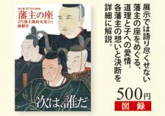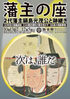 平成27年10月13日(火) ~ 12月5日(土)佐賀藩は11代にわたる藩主によって治められてきましたが、その家督相続は、他家から養子を迎えることなく続いた点に特徴があります。ただし、藩主の座が親から子へと受け継がれたのは五度だけで、孫や兄弟による相続も少なくありませんでした。そのうち3代綱茂(つなしげ)公・4代吉茂(よししげ)公・5代宗茂(むねしげ)公は、いずれも42人の子女をもうけた2代光茂(みつしげ)公の御子様方です。兄弟による相続の場合、藩主の座はどのようにして決められたのでしょうか。
