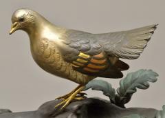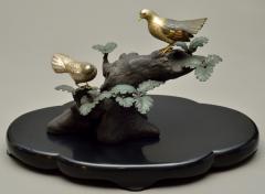 古木に止まる2羽の小鳥の姿に惹きつけられる置物。両足でしっかりと幹を掴み、尾羽をピンと張ったその姿からはどこか緊張した様子が感じられる。一枚一枚の羽毛の流れや、脚の鱗、鋭い爪の先にいたるまで緻密に表されており、近付けば今にも飛び立ってしまいそうなほどに生命感にあふれている。