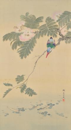 落款にある「梅崖女史」は12代鍋島直映(なおみつ)夫人禎子(ていこ)の号。直映とともに禎子は、花鳥画を得意とした荒木寛友に師事し日本画を学んだ。画面左下にかけて細く長く垂れ下がる一枝が小さく揺れた時、川魚を捕えた翡翠が瞬時に画幅から消え去る。そんな次の瞬間が目に浮かぶような、張り詰めた一瞬を合歓木の花の薄桃色など柔らかい色調でまとめた夏の一幅からは、婦女の嗜みの域を超えた画技を感じさせる。