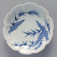 江戸時代、幕府への献上品などの生産を目的として佐賀藩によって領内伊万里郷の大川内山に設置された藩窯で作られた鍋島焼。染付で描かれた直線的な笹の葉や、すっと伸びた筍がシャープでありながら、器形に沿って湾曲した笹枝や、輪花形の縁がやわらかな印象を与える。丁寧に濃淡がつけられ、筍の皮の丸みや笹の葉先の薄さを表されている。高台の櫛歯文様は鍋島焼の特徴の一つ。裏文様として5か所に牡丹の花を配す。