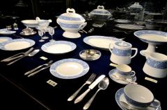 関東大震災以後、侯爵鍋島家の本邸となった渋谷・松濤の鍋島邸にて使用されていたもの。現存するだけでも肉皿は106枚あり、家紋入りの銀器やガラス器と共に大人数の食卓を彩ったであろう。