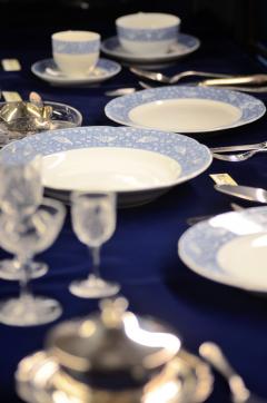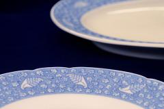 家紋を散らした、鍋島家特注の洋食器セット。各食器の縁には帯状の染付に白抜きで、鍋島家の家紋・杏葉紋を図案化して散らした唐草模様を表す。スープ鉢や果物台鉢、パン皿、肉皿、珈琲碗など多様ながらも、全体的にシンプルかつ統一感のあるデザインでまとめられている。