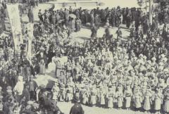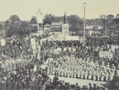 当日の写真をみると、シルクハットを被った参列者から踊りを披露する子どもまで、老若男女を問わず様々な人で賑わった。唐人町や岸川町など町名の書かれた旗もひるがえるが、旧城下の各町では競って電飾や作り物を凝らしたり、茶店や相撲を開催したりと、城下全体が奉祝ムードに包まれたという。