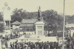 10代佐賀藩主鍋島直正(閑叟)公の生誕から100年を迎えた大正2年(1913)、佐賀城北御堀端(現・徴古館北東)に、県内外からの寄附金により銅像が建設された。11月10日の除幕式では、大勢の市民が見守る中、11代鍋島直大公によって銅像にかかる紅白の幕が取り除かれた。式辞を述べたのは、建設委員長を務めた大隈重信。