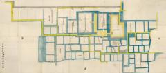 龍造寺家の中興とされる康家は、男子5人のうち二男・家和に佐賀城(いわゆる村中城)を譲り、新たに築いた水ヶ江館に隠居した。本図はその周辺の屋敷や居住者などについて記された水ヶ江御城図。道路や水路(堀)、土手、屋敷割りも詳細な上、観音堂など一部の建物は絵画的な描写も伴う。やがて康家からその隠居領を譲り受けたのは四男・家兼(剛忠)。本図の「剛忠公御隠居所」と記された区画には、「周家公(剛忠の孫/隆信父)、慶誾公(周家室/隆信母)、天理公(長信/隆信弟)相継テ御住居、隆信公御出生此所也」とある。ここで誕生した龍造寺隆信(1529~84)は、のちに領国をもっとも広げ、五州二島の太守として名を馳せることとなる。また、同区画の〇印の箇所には「隆信公御イヤ塚」(イヤ塚=胞衣塚。胞衣は臍の緒の意)が表されている。現在、この地は「龍造寺隆信誕生地」として佐賀市史跡となり、徴古館の創設者12代鍋島直映公の揮毫になる記念碑が建てられている。