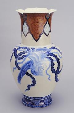 色絵や青磁、染付などの技法を随所に駆使した大花瓶。肩から胴にかけて大胆に配された鳳凰は、染付と陽刻で羽毛などの質感までも繊細に表現されている。一見、無地の余白に見える乳白色の地の部分は、淡黄色の渦巻状の雲気文で埋め尽くされている。文様は、通常は人目に触れることのない底部にまで及んでおり、その中央には深川製磁製であることを表す「富士に流水」のマークが控えめに配される。