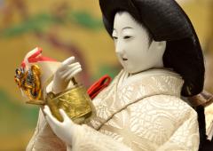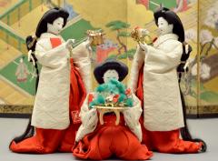 13代鍋島直泰夫人 紀久子様(朝香宮鳩彦王の第一王女)所用の雛人形のうち、宮仕えの女官たちを表す三人官女の御人形。向って左端の官女が持つのは盃に酒を注ぐ長柄銚子、右端は長柄銚子に酒を注ぐための加銚子、中央は松竹梅の飾り物を乗せる島台となっている。