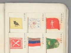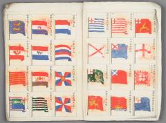 佐賀藩の御進物方で保管されていた、世界の旗図鑑。イギリス・オランダ・フランスなどの西洋諸国を始め、トルコやペルシャ(イラン)、モンゴル・韃靼など中東やアジアにまで及ぶ。国王の旗や各州の旗など、カラフルに描き分けられており、巻末の増補の部を含めると全244種類(オランダだけでも27種類)に上る。佐賀藩は長崎周辺にも藩領をもち、福岡藩とともに長崎港の警備を担っていたため、こうした知識が求められたのだろう。「白帆注進外国船出入注進」(鍋252-56)の旗印と見比べるのも面白い。