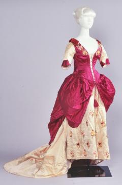 膨らんだスカート上部や上衣の身頃、袖カフス部分には鮮やかなマゼンタ色のサテン地が用いられている。スカートや胸元には薔薇の刺繍のアップリケ、肩には身頃と共布のリボン、さらに小さなビーズやレースで可憐な装飾が施されている。これを身に付けた際の写真と「写真油絵」が遺されており、裏面の書付から「仏国(フランス)の昔の人の姿」を模した装いと分かる。