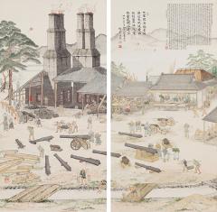 右幅の右上部には昭和3年2月に作者・青里による「佐賀築地大銃製造方及反射炉由来」が記されている。これによれば、「国家統一して工場の廃、既に六十有余年、遺址殆ど復尋すべからず、因って旧記を案じ図してこれを表す」(原漢文)といい、旧記に基づき描いたという。その左隣には昭和2年6月、祖父である直正の偉業を詠んだ12代直映(なおみつ)による漢詩が記されている。