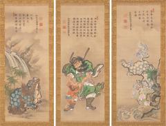 力強い阿・吽形の獅子と鍾馗(しょうき)の図。赤い小鬼の顎を掴む鍾馗は、疫鬼を退け、魔を除くという中国の故事に基づく神であり、日本でも端午の節句の五月人形や幟などに描かれる。左右幅には、静かに佇む吽形と躍動感のある阿形の獅子が対照的に構える。