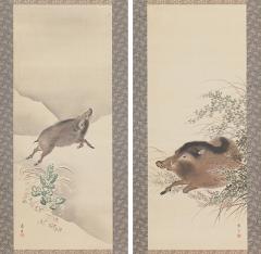 左幅は雪山を駈ける猪を描き、草木に積もる雪は薄墨で巧みに表す。右幅は、小さな紅白の花をつけた萩とすすきの中に悠然と座す猪を描く。