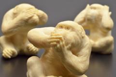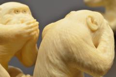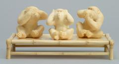 象牙を用いて彫り表された竹の台に座る身長わずか5.5cmほどの三匹の猿。「見ざる・聞かざる・言わざる」それぞれの表情や仕草が見どころ。毛並みの微細な流れや骨ばった指先まで行き届いた繊細な彫りにより、写実性とユーモラスさを感じさせる。