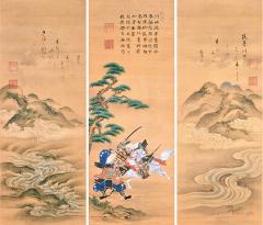永禄4年(1561)9月、武田信玄と上杉謙信が北信濃を争った川中島の戦いの図。謙信の太刀を信玄が軍配で受け止めたと言い伝えられる一騎打ちの場面を中幅とし、左右に筑摩川と姨捨山を描く。