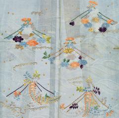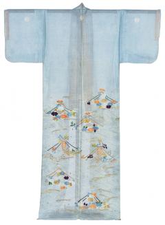 織り目の透ける絽の、浅葱色の涼やかな夏物の小袖。地に模様を染抜き、橙や紫、金などの刺繍と鹿の子絞りで、舟に見立てた藤や菊、牡丹の花々が波間に漂う様子を表す。袖(前後)と背の5カ所に鍋島本家の筋杏葉紋を配した五つ紋の礼装。