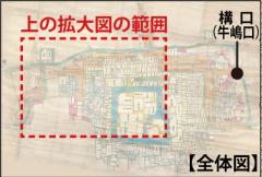 背景に着色が無い区域(城内やその周囲)は武士たちが住んでいた武家地。「○○町」という名前の町人地は武家地の外側に位置している。町人地のうち、赤枠と町名を付けた区域は、江戸時代のはじめにまちづくりが行われた際に蛎久周辺から移されたとされる町。