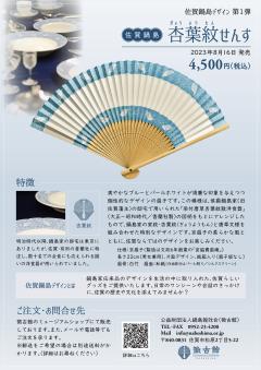 「佐賀鍋島 杏葉紋せんす」は、爽やかなブルーとパールホワイトが清廉な印象を与える、個性的なデザインの扇子です。ブルーに白抜きで表されている模様は、侯爵鍋島家(旧佐賀藩主)の邸宅で用いられた「染付唐草杏葉紋散洋食器」(大正~昭和時代/香蘭社製)の図柄をもとにアレンジしたもので、鍋島家の家紋・杏葉紋(ぎょうようもん)と唐草文様を組み合わせた特別なデザインです。