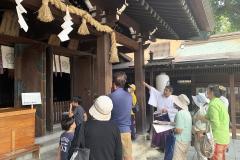 開催中の展覧会の関連イベントを行いました。当館学芸員による展示解説ののち、佐嘉神社に場所を移し、眞﨑禰宜のご案内により神社の鳥居や拝殿、神門など、創建当時の写真や図面と見比べながら探訪しました。秋晴れの空の下、午前・午後の部あわせて30名の方々にご参加いただき、佐嘉神社の創建や御祭神・直正公に関する様々なエピソードに触れ、「わが町の神社」である佐嘉神社により親しんでいただけるイベントとなりました。 |