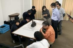 久留米工業高等専門学校の先生と学生の皆さんにより、当会所蔵の蒸気車雛形(1855年製)の調査が行われました。当日は3Dスキャナによる測定のほか、蒸気車のクランク機構などもご覧いただき、熱心な議論が行われました。今回の測定結果をもとに、市内のイベント等で活躍している走行用蒸気車レプリカ(佐賀市所有/過去に同校にて製作)の修理やデジタルアーカイブ化が行われます。 ⇒久留米工業高等専門学校のページ |