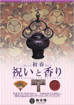 鍋島家伝来の香道具を特集した初めての展覧会。平成22年の干支である虎を描いた掛軸や吉祥模様の能装束、中国・龍泉窯の青磁香炉や華麗な蒔絵の十種香箱など、佐賀藩主鍋島家伝来資料のうち「祝いと香り」をモチーフにした美術工芸品を展示し、初春を寿ぎました。